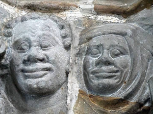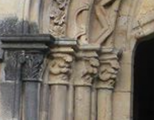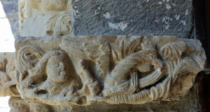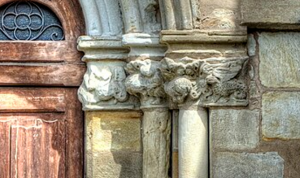 En el arco triunfal, en el capitel izquierdo hay arpías, mientras que el derecho es una escena con guerreros a pie y a caballo.
