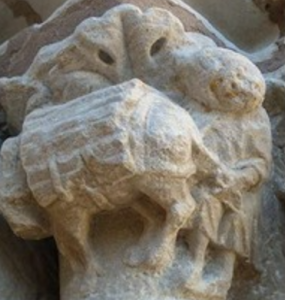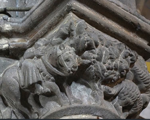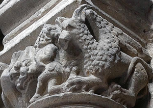 Los capiteles de las naves son de estilo protogótico, aunque muestran escenas románicas del bestiario, como dragones, arpías y grifos. Destaca especialmente el capitel donde dos jinetes y perros de caza baten a un jabalí. Representa la lucha del Bien contra el Mal. Hay otros capiteles, de factura gótica, que representan rostros humanos con expresiones emotivas: algunos sonríen, evocando el paraíso, mientras que otros, con gesto triste, son los alejados de Dios.