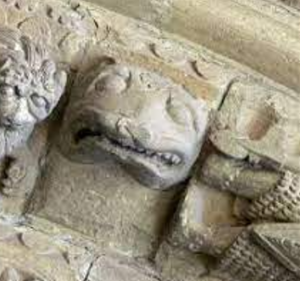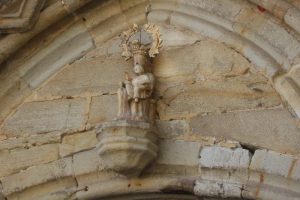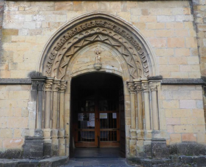 La puerta meridional es la más antigua del templo. Sus tres arcos de medio punto están decorados con baquetones. Los capiteles, erosionados por el tiempo, tienen escenas románicas del bestiario: un dragón, un basilisco y una anfisbena. También hay escenas costumbristas, como la de un campesino arreando un asno cargado de leña, que es interpretada como alegoría del hombre que ha perdido el rumbo. Los capiteles descansan sobre dos fustes acodillados a cada lado.