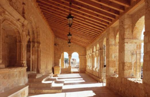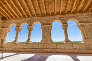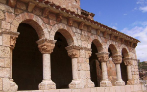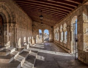 La galería porticada, de piedra de sillería, está orientada al sur. Tiene en el muro meridional ocho huecos y la puerta de entrada, y dos más orientados al este. Conserva de su fábrica original cinco huecos: la puerta y dos tramos, uno con dos arcos y otro con tres; los restantes son posteriores. Los arcos de medio punto reposan sobre capiteles que contienen escenas muy expresivas. Se aprecian figuras humanas con vestimenta musulmana, como turbantes y túnicas de mangas anchas. Este rasgo se explica por la llamada frontera del Duero, que propició un intercambio cultural. La cubierta de la galería es de madera.