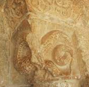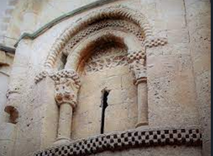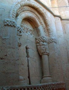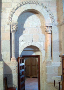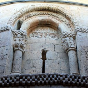 El ábside está dividido en tres calles por semicolumnas, cuyos capiteles muestran relieves de gran finura con motivos vegetales, hojas, palmetas, volutas y animales fantásticos, como cuadrúpedos y leones afrontados.