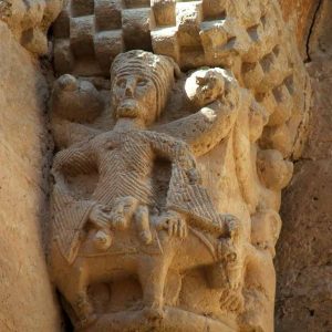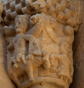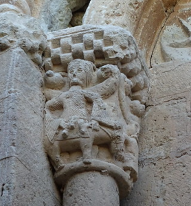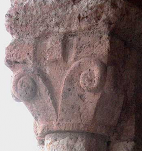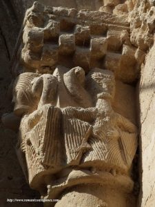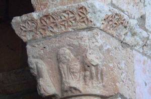 Los capiteles son cestas cuadradas con relieves toscos y, aunque expresivos, evidencian el carácter primitivo de la escuela escultórica. Hay un hombre que sujeta a dos caballerías, figuras de músicos; aves con alas desplegadas o cazando liebres; leones devorando presas; serpientes entrelazadas; e incluso figuras que sugieren pactos o gestos de conciliación y motivos vegetales. Este estilo rudo les confiere un encanto especial. Se trata de un lenguaje escultórico de carácter social y bélico, más que litúrgico o bíblico.
