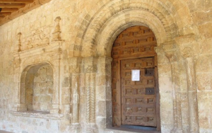 La sacristía del siglo XII es una ampliación posterior a la fábrica original. Su puerta es más sencilla que la de la entrada principal del templo: se trata de una pequeña abertura románica formada por un arco de medio punto ornamentado con un ajedrezado y con una arquivolta ligeramente rehundida, que crea un pequeño hueco de acceso. La arquivolta se apoya directamente sobre dos pequeñas columnas que sostienen la estructura del vano y los capiteles. El del lado izquierdo tiene hojas de acanto estilizadas con incisiones geométricas sencillas. En el capitel derecho se aprecian aves afrontadas con los picos entrecruzados, interpretadas como símbolo de la concordia o del alma que se alimenta de lo divino.