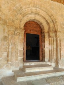 La puerta principal, situada dentro de la galería, presenta tres arquivoltas de medio punto: la interior, lisa; la segunda, con motivos geométricos y vegetales; y la exterior, más ancha, decorada con flores inscritas en cuadrículas. Los arcos descansan sobre dos capiteles a cada lado. En el derecho, un músico barbado con túnica y gorro puntiagudo tañe un instrumento de arco mientras un joven lo contempla; junto a ellos, un ave rapaz atrapa a dos aves menores. En el lado izquierdo, un mono con un lazo en el cuello simboliza el pecado, mientras que en el otro una serpiente perlada muerde a un ave. La combinación de escenas armónicas y violentas transmite un mensaje de advertencia: dejar atrás lo mundano y el pecado antes de ingresar al espacio sagrado.
