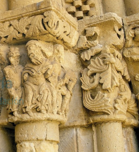 Los capiteles están historiados con escenas bíblicas, pero el paso del tiempo y la fragilidad de la arenisca los han deteriorado considerablemente. El capitel interior del lado izquierdo enseña una pareja de aves atacando cabezas de animales. En el central hay una tosca representación del Pecado Original: Adán, desnudo, aparece en el momento de comer el fruto, y Eva ya lleva puesta la hoja de parra, signo de su pecado. Una serpiente se enrosca en el árbol y se dirige hacia la mujer. En el capitel exterior hay dos personajes; el de la derecha se lleva una mano al pecho mientras mantiene la izquierda levantada, dirigida a la otra figura. Probablemente, el escultor pretendió, con escaso acierto, representar la Anunciación.