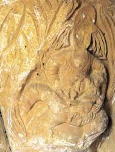 En el lado derecho, en el capitel interior, vemos a tres personajes masculinos de largos cabellos y barbas llameantes. La mitad inferior del cuerpo y sus extremidades son de animales. La cesta central está muy estropeada. Se cree que es una representación de la Huida a Egipto, con María sosteniendo al Niño en sus brazos y montados en un pequeño asno que guía un irreconocible San José. Da la impresión de que María ofrece un fruto al niño. En el capitel exterior, hay un personaje sentado, vestido con una túnica de grandes pliegues paralelos, y a cada lado, dos leones con las cabezas inclinadas, lo que sugiere que se interprete como Daniel en el foso de los leones.