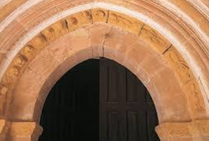 La arquivolta interior está decorada con escenas figuradas, mientras que las demás presentan ornamentación geométrica como puntas de diamante, baquetones y billetes. Las impostas de los capiteles exhiben rosetas de pétalos y hojas.