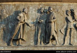 Sobre estos relieves se alzan cuatro esculturas en las esquinas, que simbolizan los valores que sustentaron la empresa de Colón: la Historia, la Náutica, el Estudio y el Valor.
