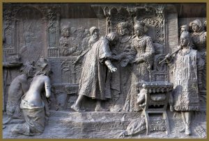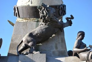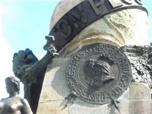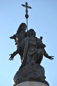 Sobre estos relieves se alzan cuatro esculturas en las esquinas, que simbolizan los valores que sustentaron la empresa de Colón: la Historia, la Náutica, el Estudio y el Valor.
