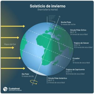 Durante el solsticio de invierno en el hemisferio norte, la Tierra se encuentra en un punto de su órbita donde el Polo Norte está más alejado del Sol. Como resultado, los rayos solares inciden de manera más oblicua y se distribuyen sobre un área mayor, lo que provoca que las temperaturas sean más bajas.