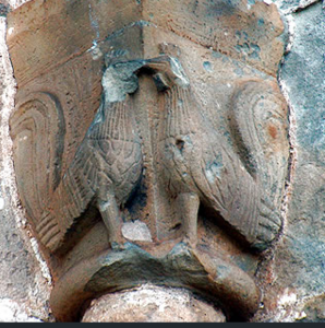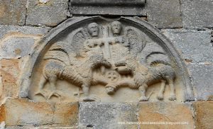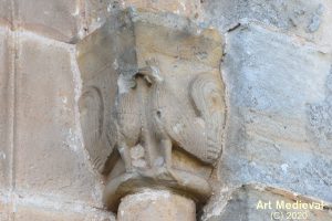 Es impactante el tímpano con un relieve incrustado en el que dos animales del bestiario románico aparecen como protectores del templo: un grifo a la izquierda y un león alado a la derecha. Ambos unen sus patas delanteras ante una cruz griega inscrita en un círculo. Encima de ellos, una pareja de ángeles sostiene una cruz latina.