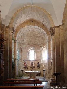 Llaman la atención las arquerías murales de la parte inferior del presbiterio. Son arcos de medio punto que se apoyan en tres columnas adornados con baquetones y con guardapolvos ajedrezados. En la unión de los arcos hay un relieve a cada lado: una pareja de leones en un lado y otra de aves. Los capiteles de los arcos tienen motivos geométricos y vegetales. Se pueden ver animales emparejados. Inciertos; una pareja de aves que podrían ser gallos; hay animales del bestiario que parecen grifos. En otro, un hombre con los brazos apoyados en su vientre tiene las garras de los leones de sus costados en su pecho. Hay un capitel complejo que muestra unos cuerpos humanos dándose un abrazo con cabezas de dragones.