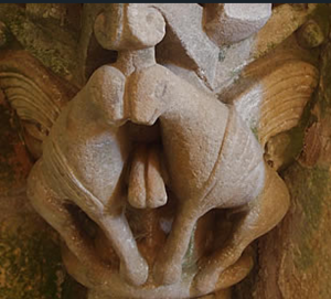 En el centro del capitel sur del arco triunfal figura una mujer como mediadora de la paz; sujeta las riendas de dos caballos que montan unos jinetes vestidos, con cota de malla, casco y las espadas alzadas. Tienen un aspecto cristiano. Algunos articulistas dicen que simboliza la paz de Dios que propone la Madre Iglesia.