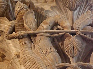En el capitel del norte, dos hombres, encima de sus monturas, combaten con lanzas. El del lado izquierdo, por su indumentaria, su casco, la cota de mallas y la forma del escudo, representa a un caballero cristiano que hunde la lanza en el escudo del caballero del lado derecho, que no lleva cota de malla y su escudo es redondo, lo que apunta a un guerrero musulmán.