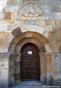 En el muro sur se abre una sencilla puerta con tres arquivoltas de medio punto sorprendentemente planas de piedra de sillería.