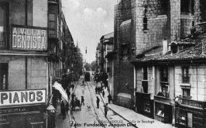 La calle de Santiago era un espacio mixto de comercio, cultura y vida social: el sonido de las campanas se mezclaba con el murmullo de la calle en un espacio estrecho, flanqueado por aceras donde el «paseo» era un ritual ineludible. No se iba a la calle de Santiago de cualquier manera: era el lugar para «ver y ser visto».
