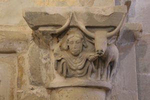 El capitel representa una junta de bueyes notablemente proporcionados y musculosos, con detalles anatómicos realistas, como la piel y las pezuñas. Sin embargo, solo se aprecia la figura de un buey por el deterioro del otro astado. Ambos están unidos por un yugo tallado, y son guiados por un hombre de largos cabellos. Su mirada es triste y con una expresión de cierta preocupación en su rostro y boca, lo que transmite una profunda humanidad. Viste una media túnica de pliegues horizontales y sus manos, fuertes, sujetan el animal a través de la argolla que cuelga de su hocico.