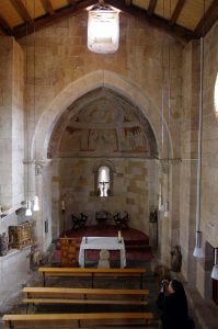 El interior del templo es sencillo y diáfano. Presenta una única nave cubierta con bóveda de cañón, un presbiterio elevado por un arco triunfal y un ábside semicircular. La decoración románica se concentra en los capiteles del arco: Daniel en el foso, orando entre dos leones, y el ángel protector enviado por Dios en el lado de la epístola.