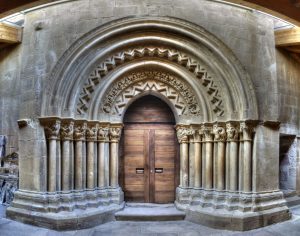 La puerta principal se abre en el muro sur. Sobre la entrada se levanta un guardapolvo o tejadillo para proteger el vano de la lluvia y otros efectos climáticos. Su estructura abocinada ayudaba a distribuir el peso y a reforzar la estabilidad. Presenta seis arquivoltas con decoración en dientes de sierra y zigzag. En la segunda arquivolta está tallada la Última Cena: Jesús preside en la dovela central, bendice a los apóstoles que le acompañan, seis a cada lado, protegidos bajo pequeños arcos y cada uno con su plato. En los extremos se esculpieron dos retratos: a la izquierda, un monje de larga melena lee un libro que se supone que es la Biblia, y a la derecha, el autor de la obra, identificado con la inscripción “Michelangelo me fecit”, se representa a sí mismo trabajando, sentado, con cincel en una mano y maza en la otra, vestido con túnica y gorro que le cubre la melena. Tras él, un libro abierto, probablemente un cuaderno de modelos, y tres piedras que esperan ser transformadas en finos arcos y delicados capiteles. Esta imagen de Michaelis resulta excepcional, pues inmortaliza al creador no solo como artesano, sino también como intelectual, consciente del legado que transmitía a la posteridad.