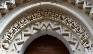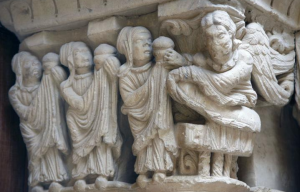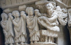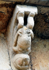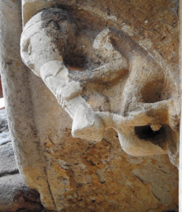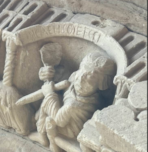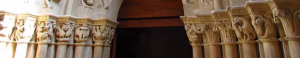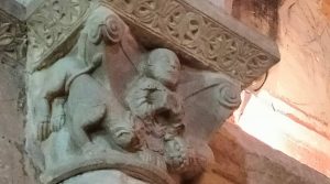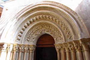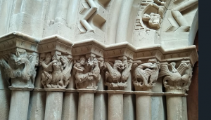 Los capiteles de la portada, en el lado izquierdo, muestran un variado conjunto: hay imágenes del bestiario, como grifos, un guerrero enfrentado a un león, identificado por los eruditos como Sansón, un basilisco y criaturas fantásticas como dragones y arpías. En el lado derecho, el capitel interior representa un Santo Sepulcro, seguido de cestas vegetales, una escena en la que un joven vence a un dragón y otra en la que un felino huye de un reptil y un dragón. El conjunto culmina con un capitel vegetal de inspiración cisterciense.