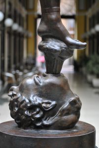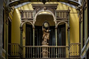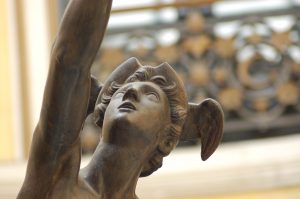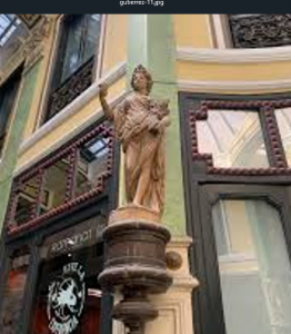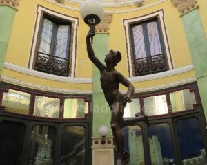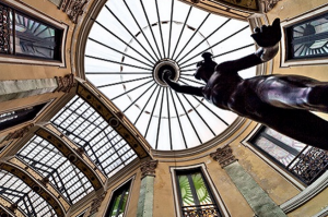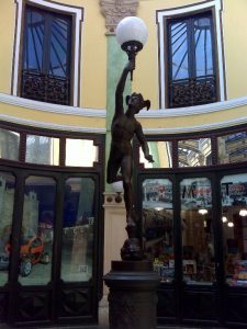 En el centro de la galería se encuentra una escultura alada en bronce de Mercurio, copia de la que está en la Galería Uffizi de Florencia o la del Museo de San Gregorio de Valladolid, ambas atribuidas a Juan de Colonia. La estatua del Mercurio volador simboliza al dios romano conocido por su agilidad y velocidad, flotando sobre el viento. Cada detalle de la escultura está diseñado para valorar la energía del movimiento. Representa la comunicación y la agilidad comercial; es el dios romano de la abundancia y el éxito. En las esquinas de los cuatro ángulos están las imágenes de bronce de las cuatro estaciones del año para significar que en la galería se podía pasear y comprar en cualquier momento del año.