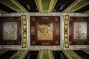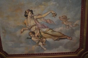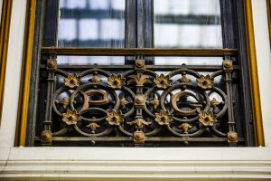Las pinturas de los techos, que representan alegorías mitológicas de las bellas artes, la industria, el comercio y la agricultura, son obra del pintor palentino Salvador Seijas. La fachada exterior es diferente en cada calle, aunque ambas utilizan hierro forjado. Se trata de rejas distintas que muestran las fechas de construcción: 1885 y 1886.