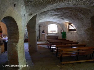 La interior costa de dos naves separadas por pilares cuadrados de roca y con una cubierta parecida a una bóveda de cañón y con sencillos elementos medievales, como el altar, y sus austeras ornamentaciones. Según el propio Garcia Guinea, mide 18 m de largo por 10 de ancho y parece ser que ha sido ampliada durante la época románica y en la renacentista.