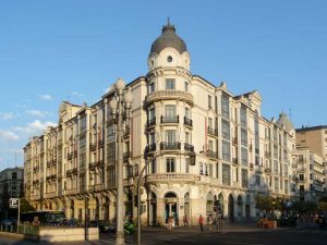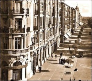 El alcalde Miguel Íscar, a finales del siglo XIX, planeó el «Ensanche de la ciudad». El proyecto abarcaba varias calles, pero era prioritario unir la estación del ferrocarril con la puerta de Santiago de la muralla. La Acera de Recoletos surgió como un eje urbano de conexión. Su origen está ligado a la desamortización de Mendizábal, un proceso que expropió bienes de la Iglesia y que, en este caso, permitió demoler varios edificios religiosos y un hospital que ocupaban entonces unos terrenos extramuros de la ciudad. Este nuevo espacio se diseñó para una conexión urbana y un paseo de ocio como un lugar de esparcimiento para la clase alta de la época.